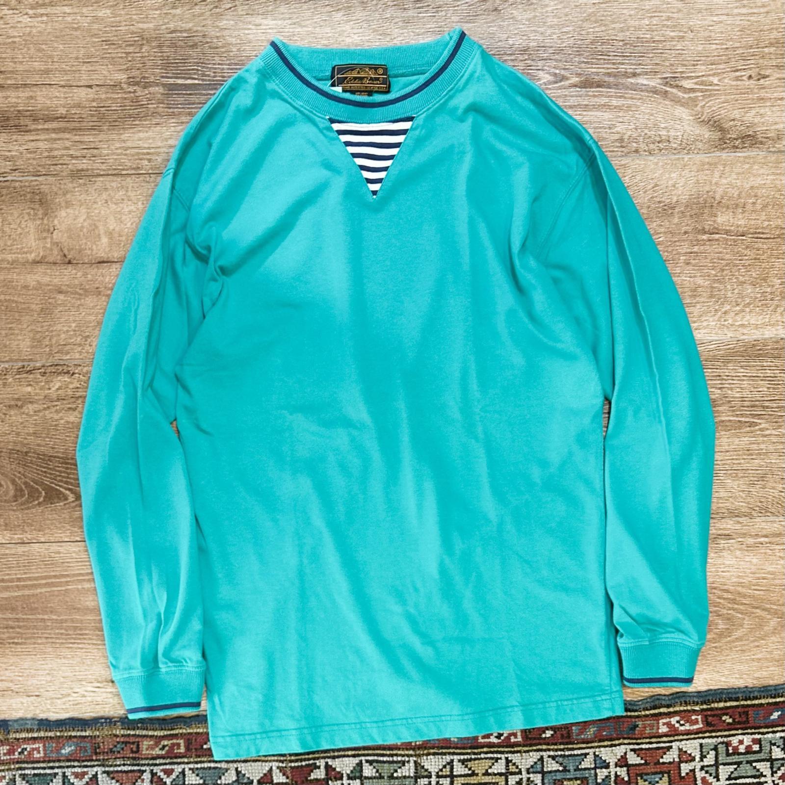 90’s〜【ビンテージ】Eddie Baue【エディーバウアー】【エメラルドブルー】黒タグ【前V】【ロンT】レディース古着【サイズW-S】