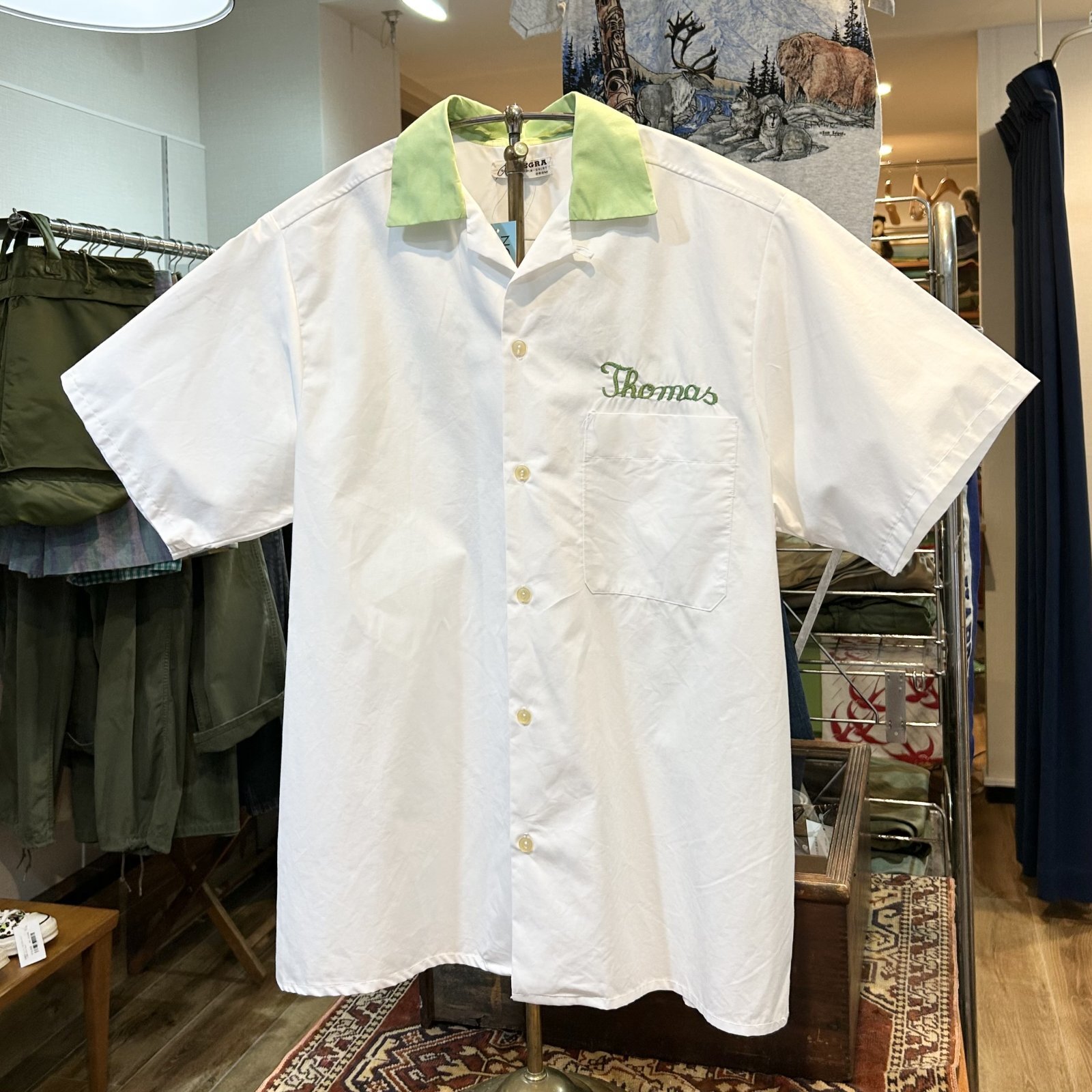 〜70’s【HEGRA】【白x黄緑】【刺繍】【GAMBLERS E.B.C MAINZ】【ボーリングシャツ】【半袖シャツ】【サイズM程度】