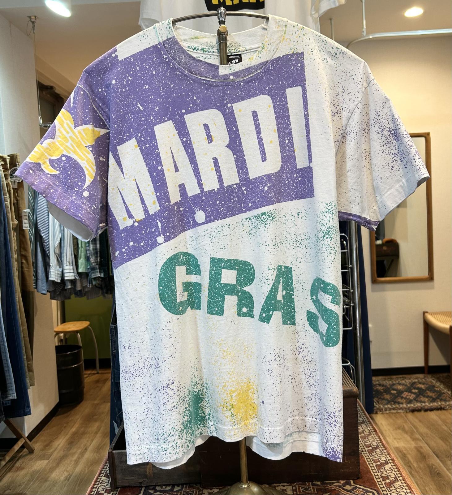 90's USA製 ビンテージ【FRUIT OF THE LOOM 】フルーツオブザルーム【MARDI GRAS】【白】総柄【 Tシャツ】【サイズL】