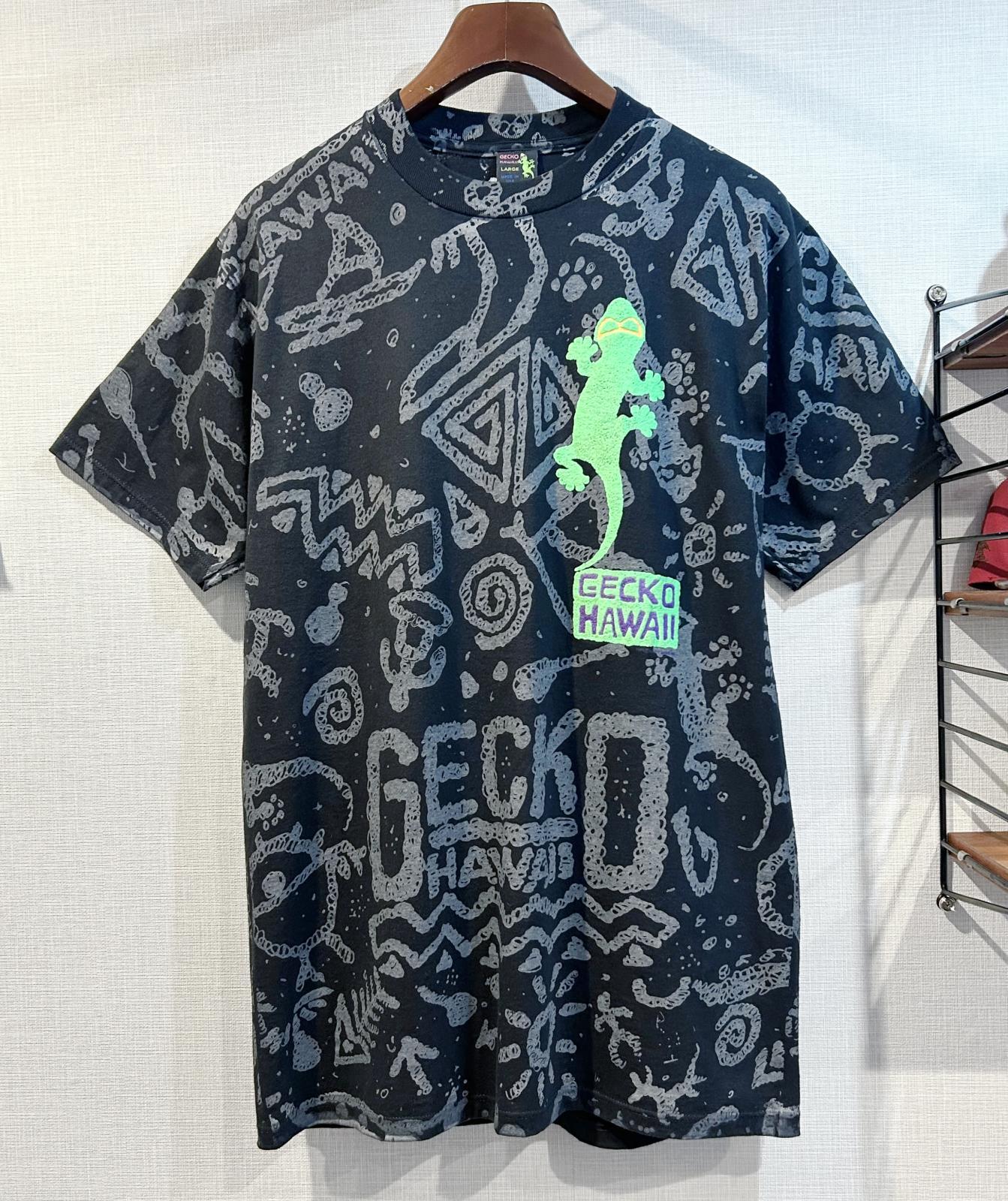 【デッドストック】【USA製】【GECKO】ゲッコー【HAWAII】【ヤモリ】総柄 黒【Tシャツ】【サイズL】