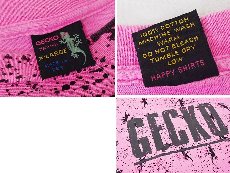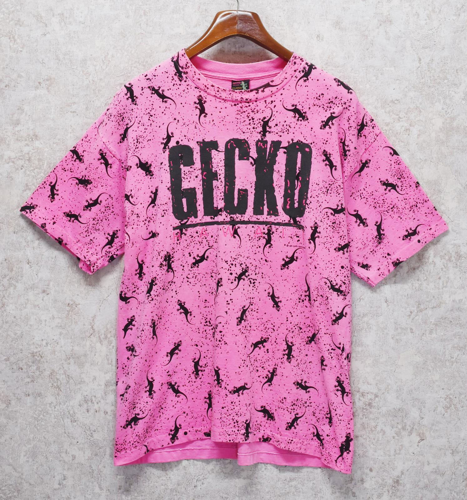 90's~ USA製 ビンテージ【GECKO HAWAII】ゲッコーハワイ【ヤモリ】【ピンク×黒プリント】総柄【 Tシャツ】【サイズXL】