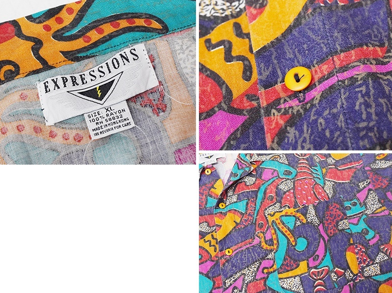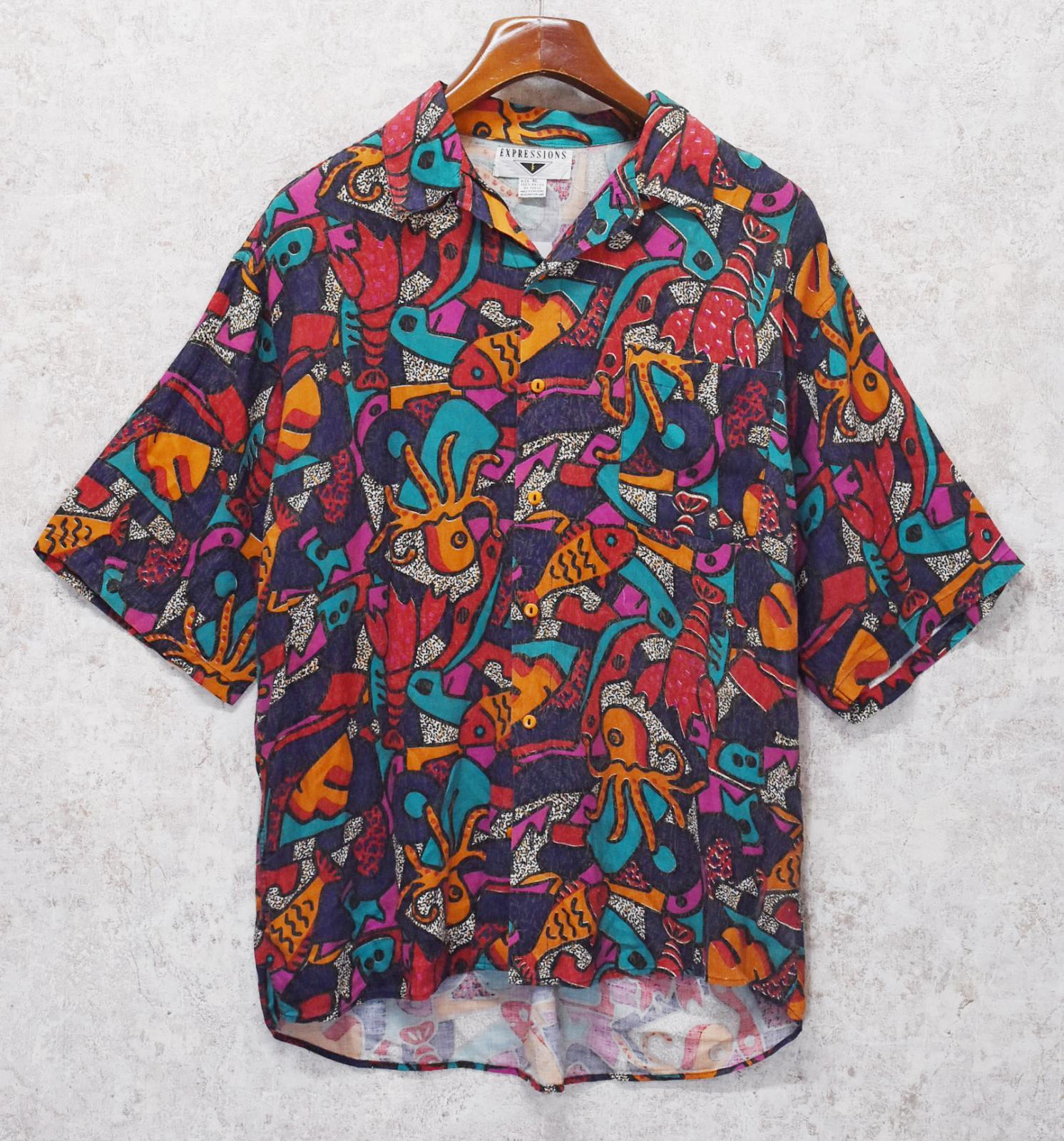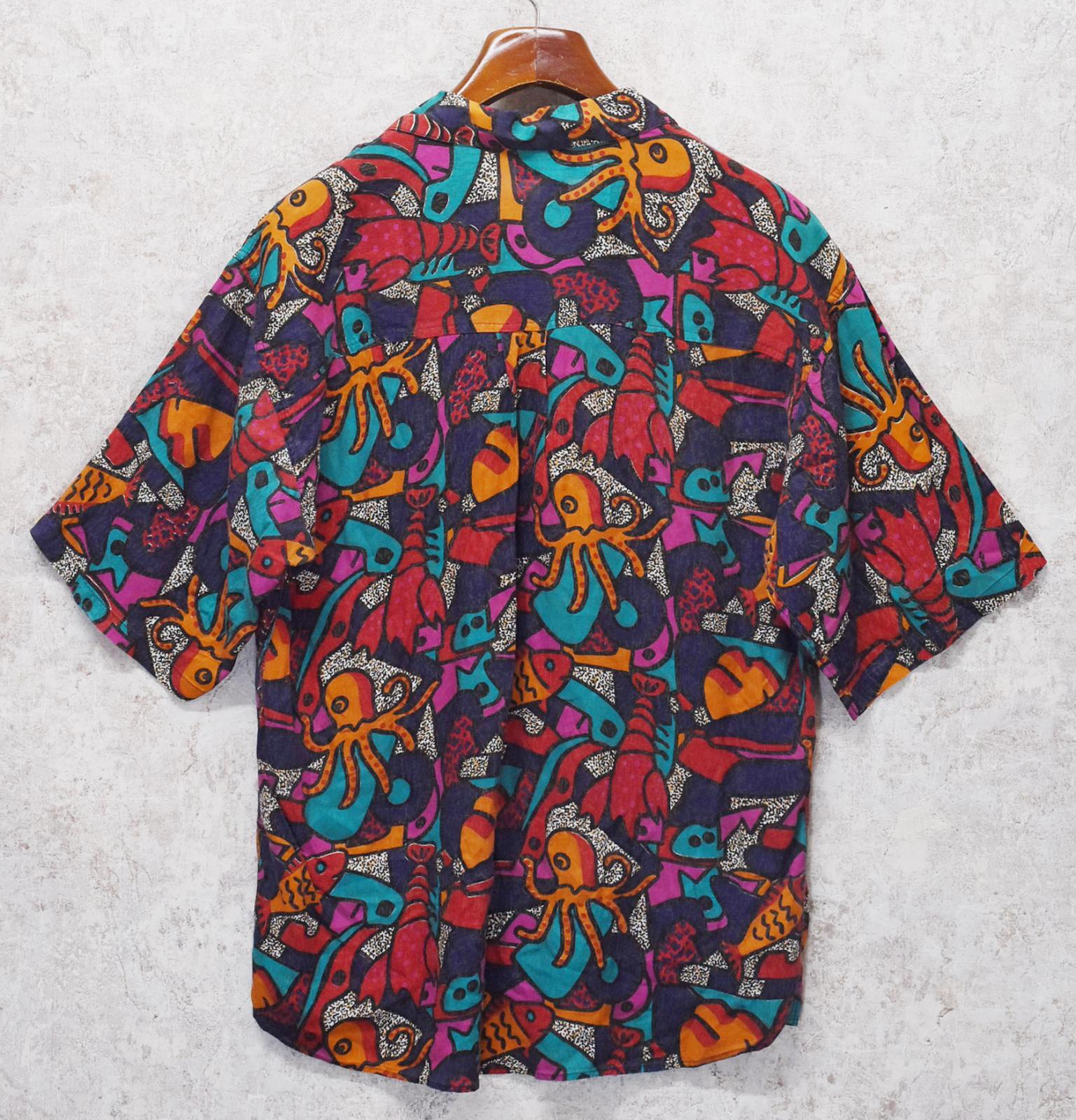 ビンテージ【EXPRESSIONS】【紺×海の生き物柄】総柄【レーヨン】【半袖シャツ】【サイズL】