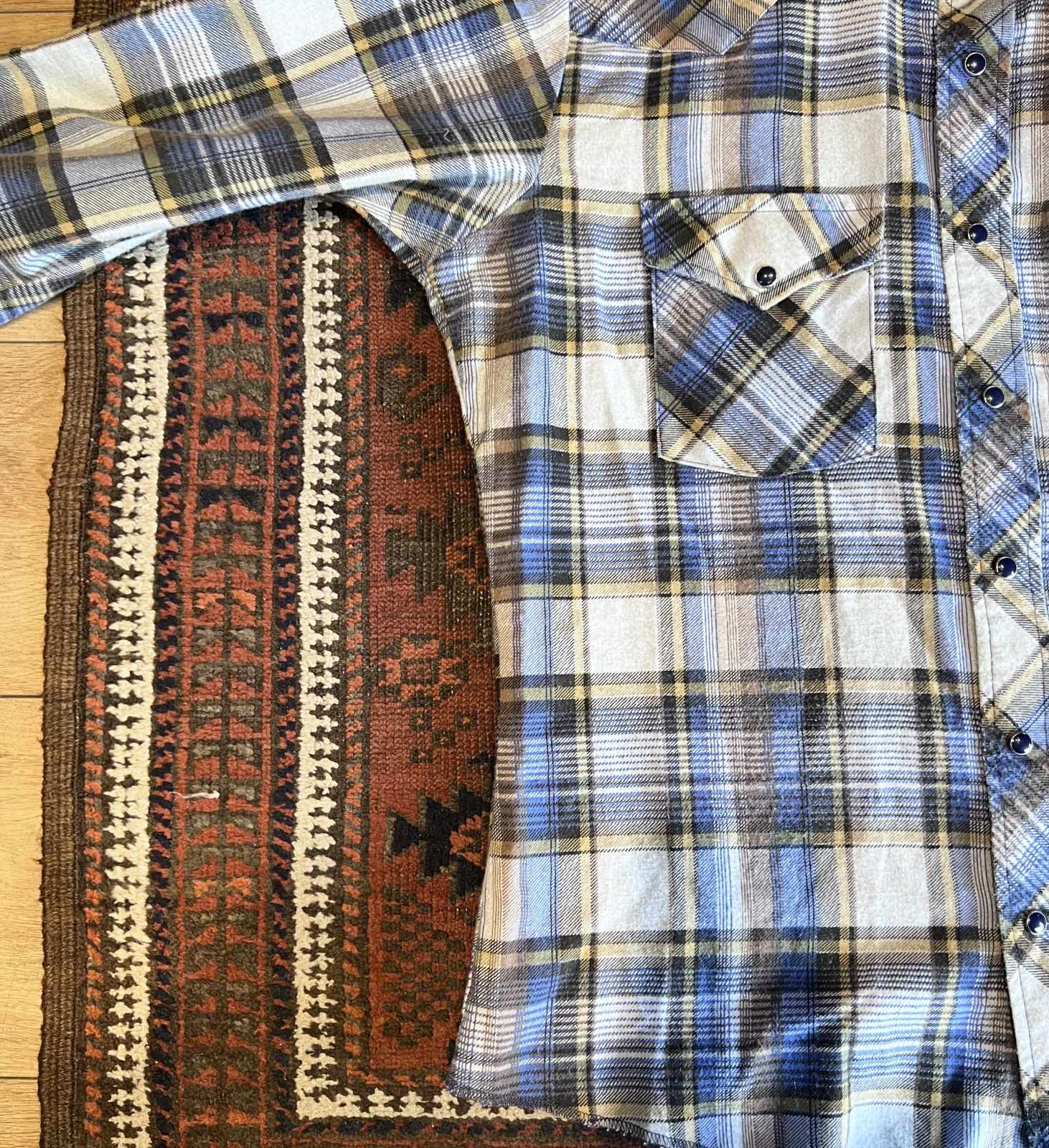 70's~【USA製】【Wrangler】ラングラー【ビンテージ】【青×黄×茶チェック】【ウエスタンシャツ】コットンシャツ【サイズL】