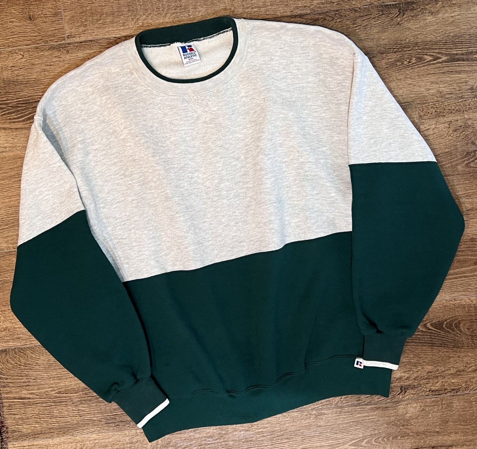 ほぼ未使用 90's~【USA製】【RUSSELL】ラッセル 【ビンテージ】【グレー×緑】切替【無地】【前V】スウェット【サイズXXL】