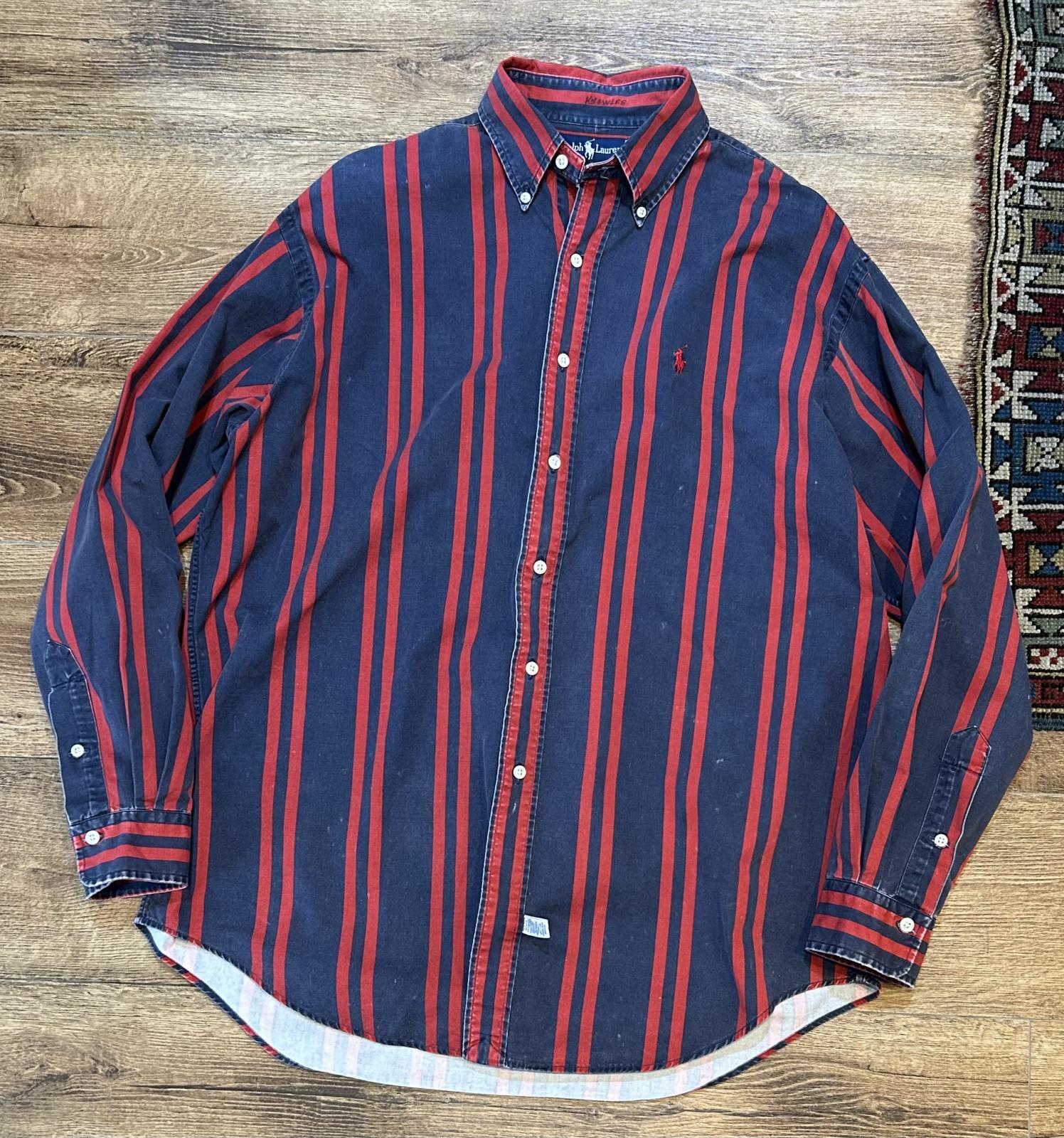 ビンテージ【POLO RALPH LAUREN】ラルフローレン【紺x赤ストライプ】【コットンシャツ】サイズL