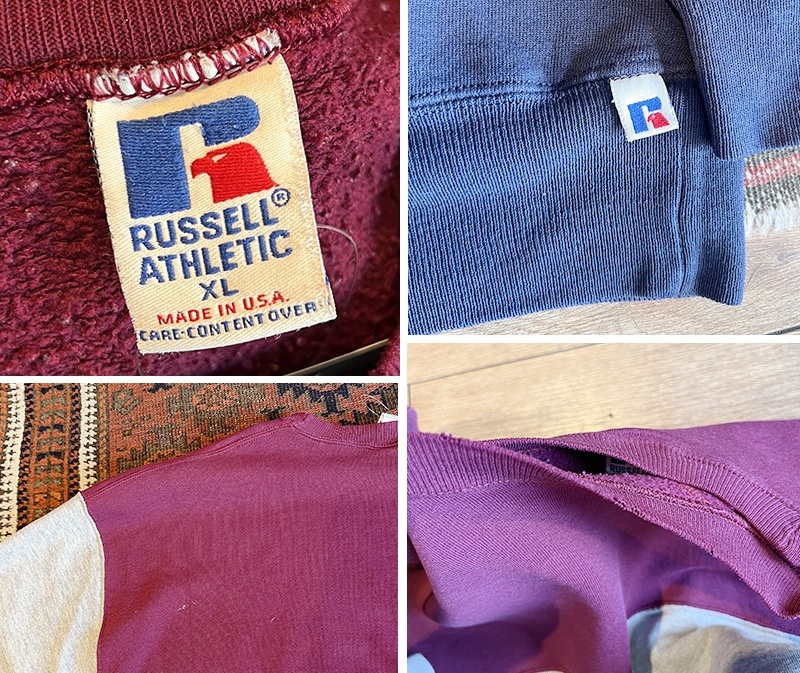 90's USA製 【ビンテージ】【RUSSELL】ラッセル 【エンジxグレーx紺】切り返し【クルーネック】前V スウェット【サイズXL】