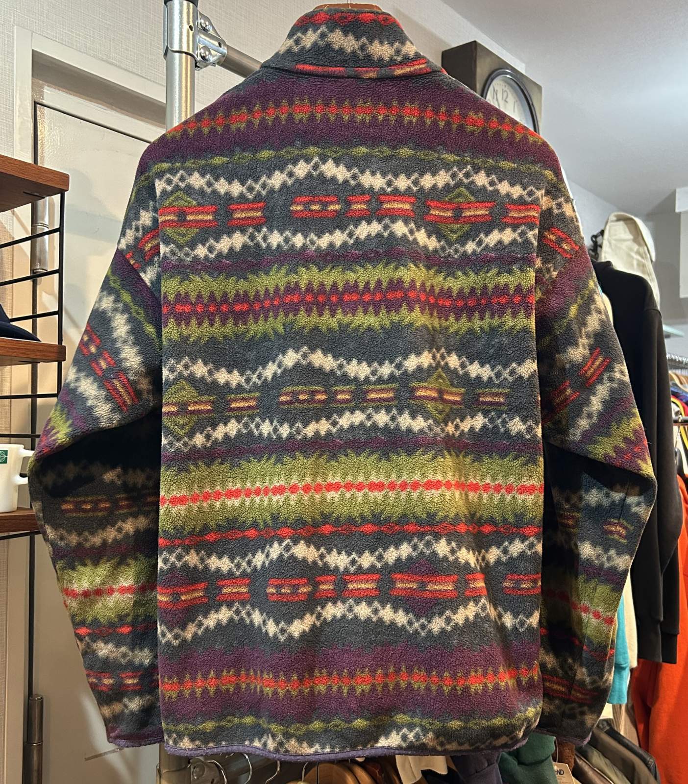 90s ビンテージ【パタゴニア】patagonia【雪無し】紫x緑xエンジ【サカジャウィア柄】【スナップT】【フリースプルオーバー】【サイズL】