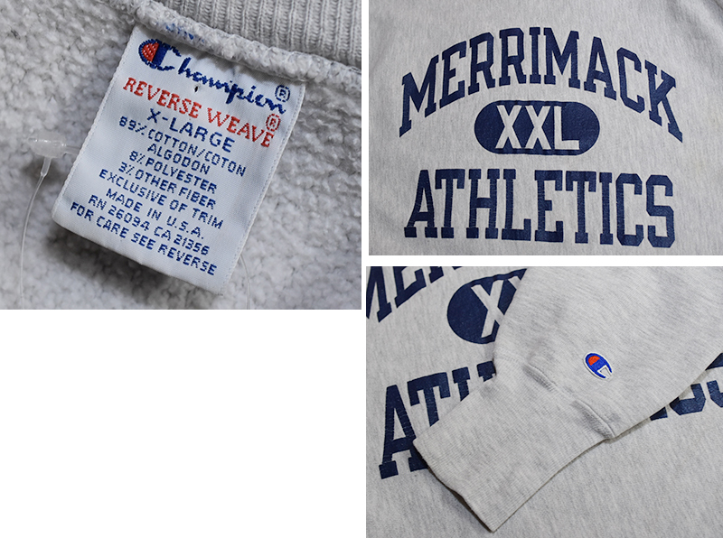 90's USA製【Champion】【チャンピオン】【リバースウィーブ】MERRIMACK ATHLETIC【グレー】【スウェット】【サイズXL】