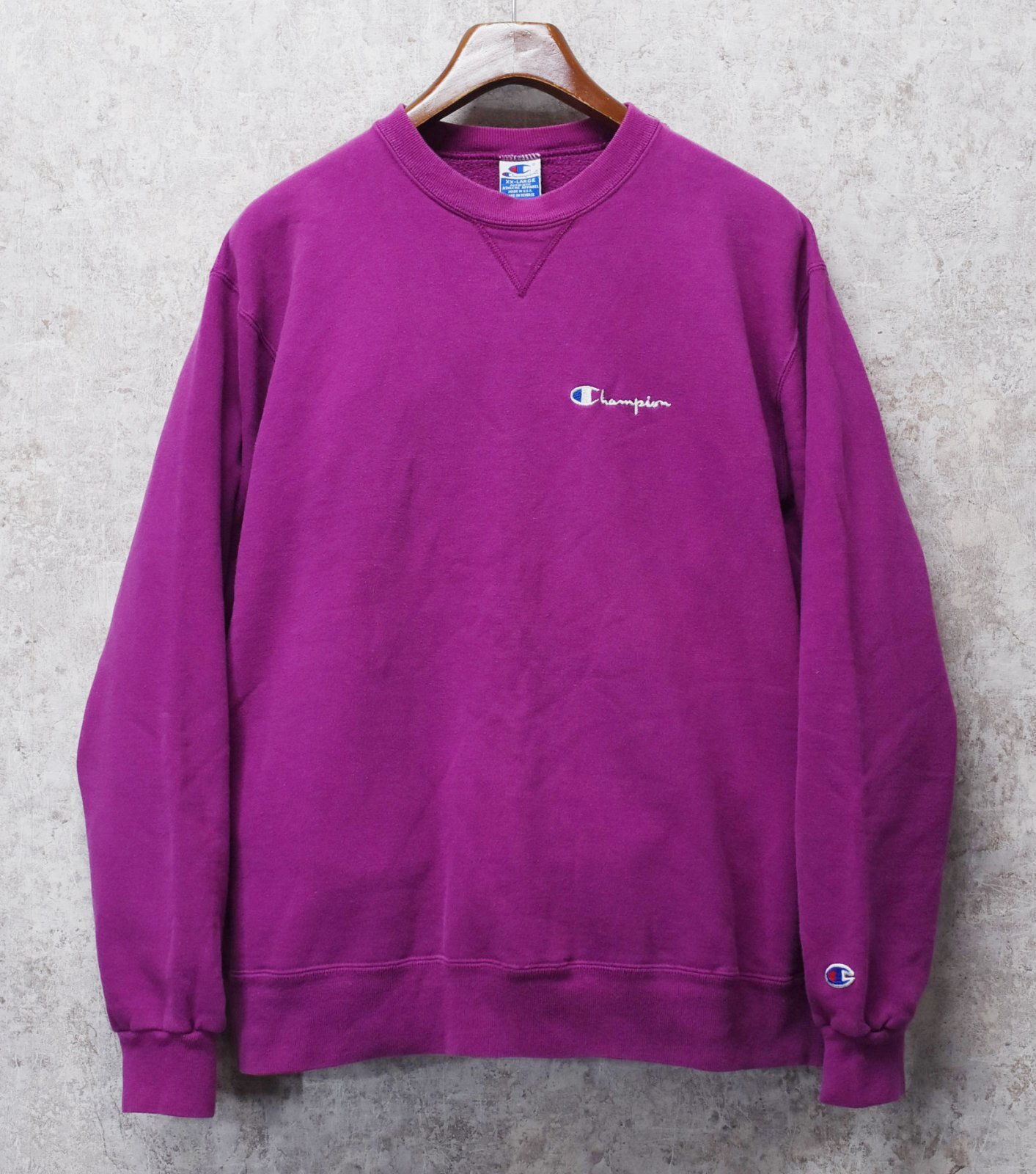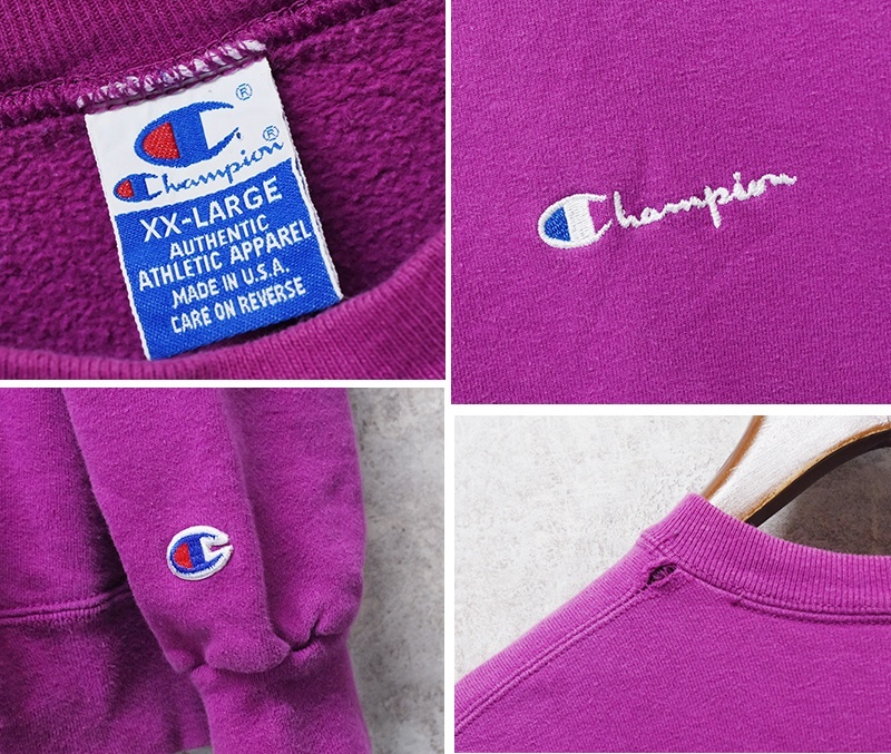 90's【ビンテージ】【USA製】Champion【チャンピオン】【紫】無地【前V】胸ロゴ入り クルーネック【スウェット】【サイズXXL】