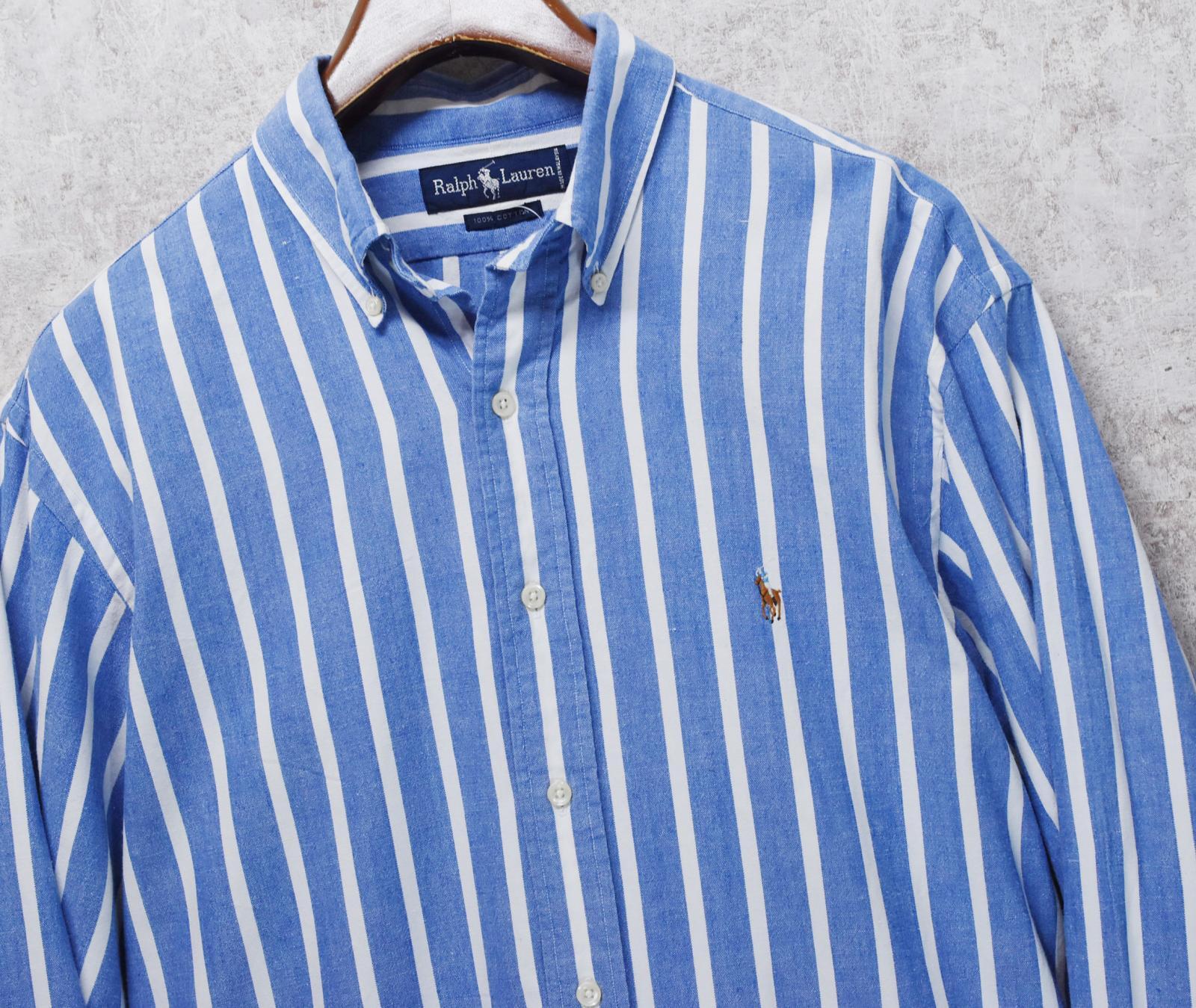 ビンテージ【ラルフローレン】POLO ralph lauren 青x白 ストライプ ボタンダウン【コットンシャツ】【US 16 1/2-34】