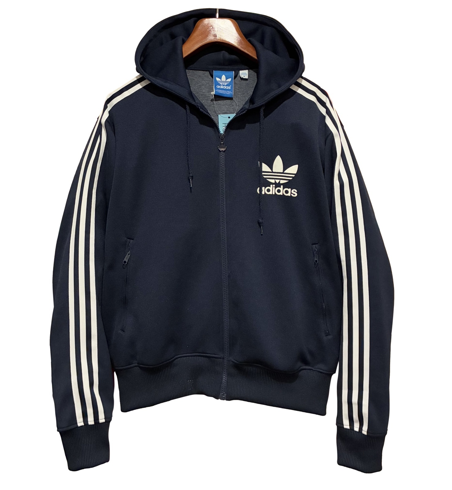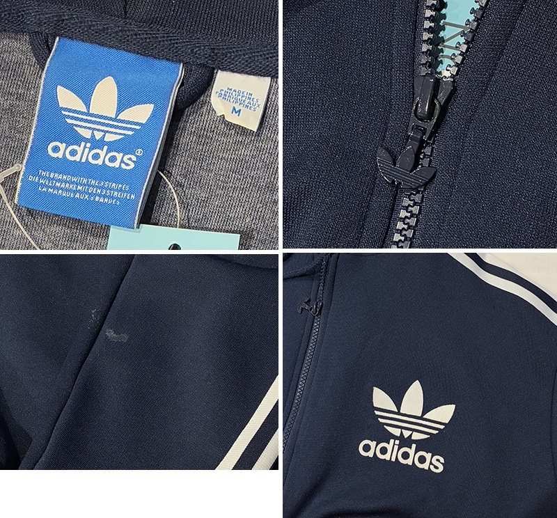 【ビンテージ】【アディダス】adidas【紺×白ライン】フード付き ジャージ【トラックジャケット】【トラックジャージ】【サイズM】