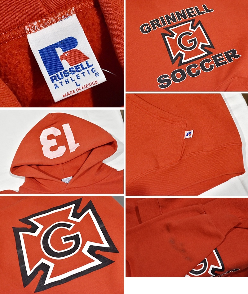 90's【メキシコ製】【RUSSELL】ラッセル 【ビンテージ】赤【GRINNEL SOCCER】サッカーチーム【パーカー】【サイズL】