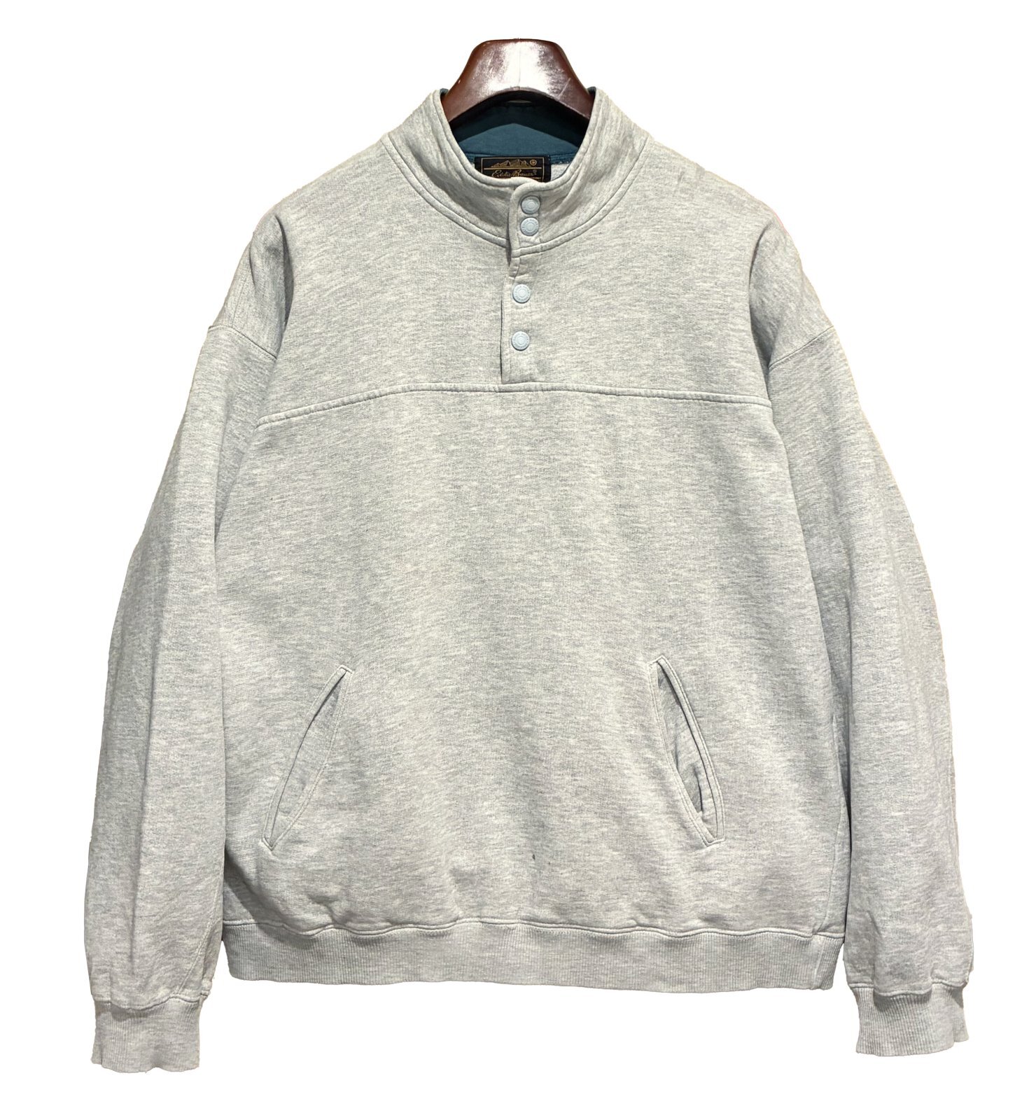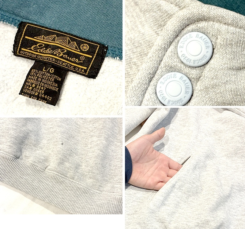 90's ビンテージ【Eddie Bauer】【エディーバウアー】【黒タグ】グレー【無地】【ハーフスナッププルオーバースウェット】【サイズL】