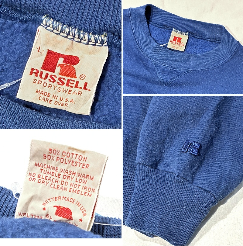 90's【USA製】【RUSSELL】ラッセル 【ビンテージ】青【無地】【クルーネック】前V スウェット【サイズL】