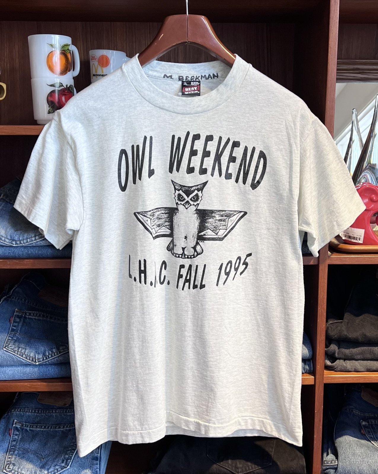 90's【USA製】ビンテージ【フルーツオブザルーム】FRUIT OF THE LOOM【霜降りグレー】【OWL WEEKEND】ミミズク フクロウ【Tシャツ】【サイズL】