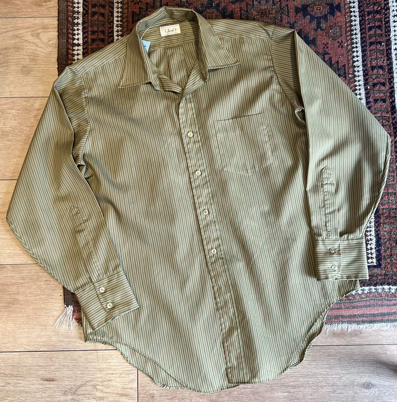 70's【ビンテージ】【BOND】ボンド【緑×オレンジストライプ】【ポリコットン】長袖シャツ【サイズXL程度】