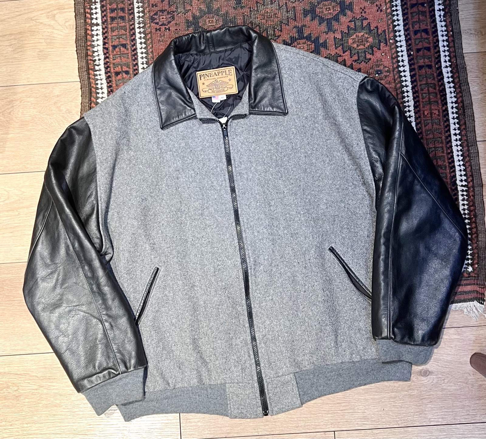 USA製【ビンテージ】【PINE APPLE】【グレーウール×袖襟レザー】【黒】【ジップアップブルゾン】【ジャケット】【サイズXL】