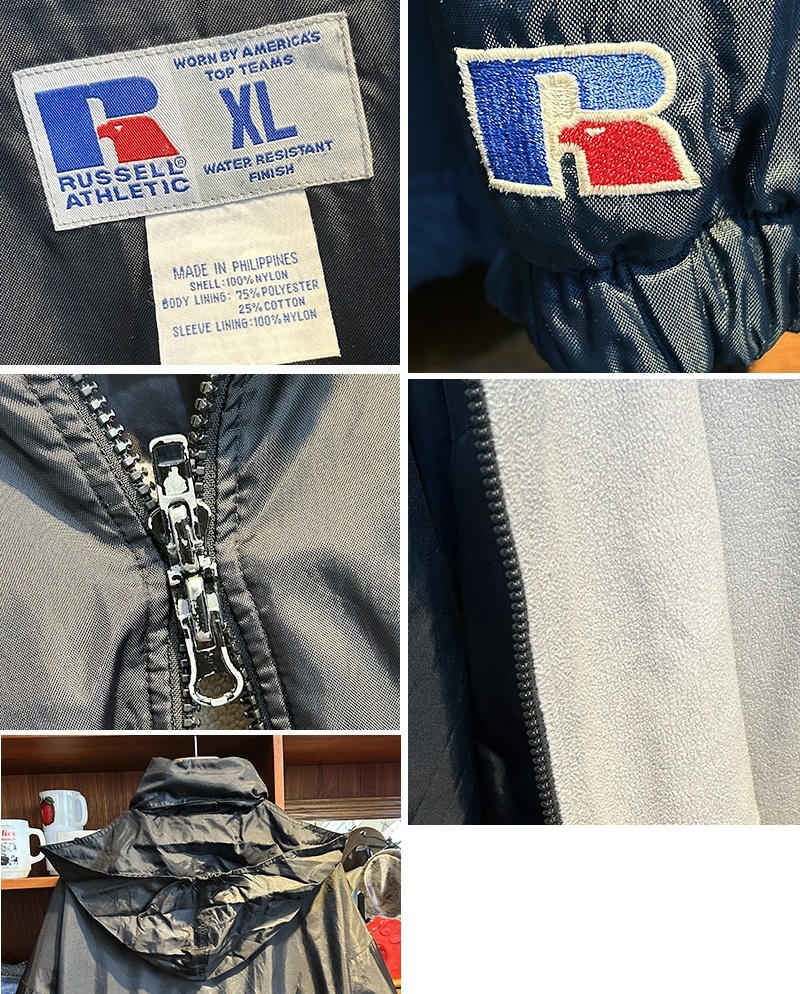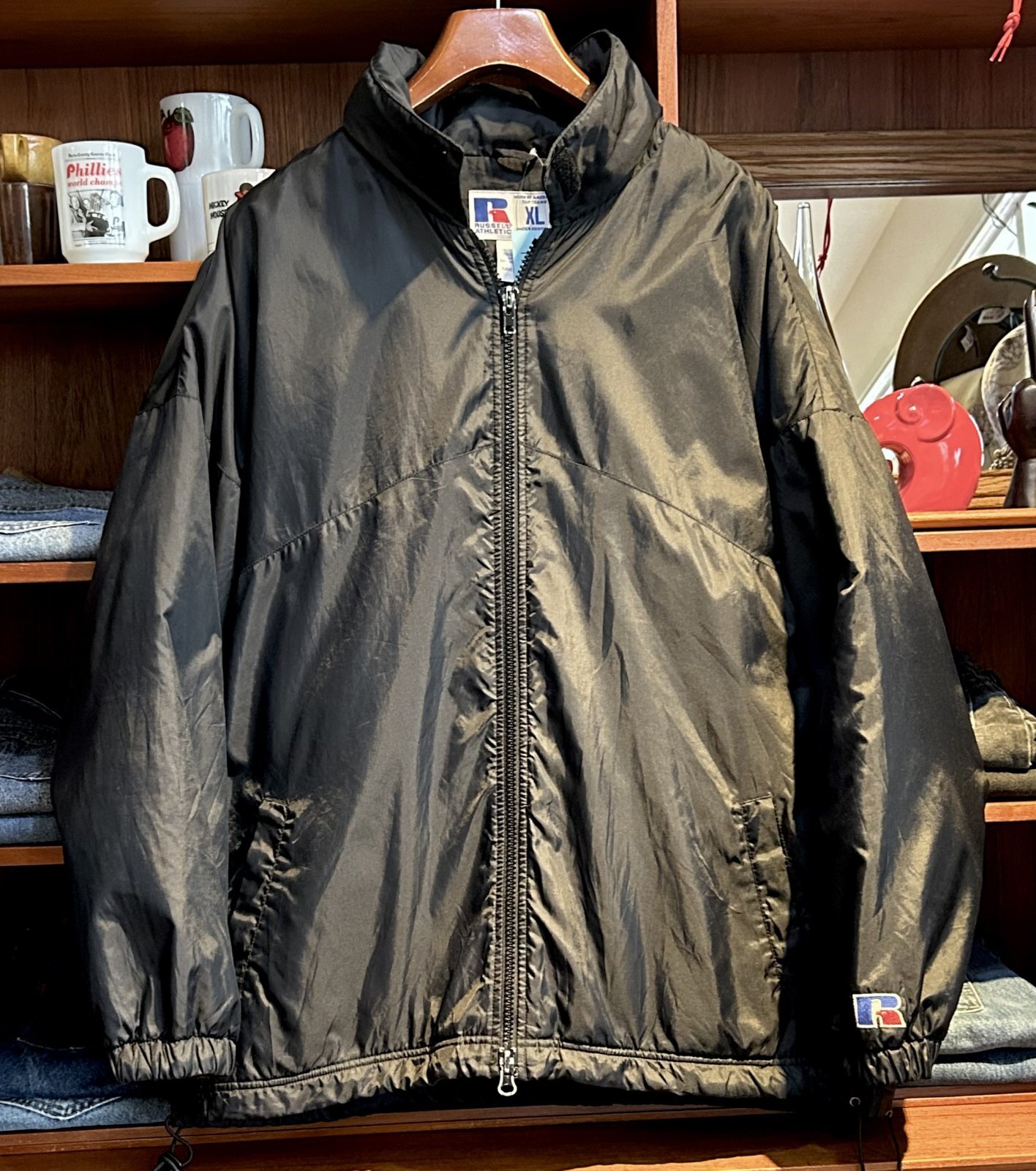 【ビンテージ】【RUSSELL】ラッセル フリース裏地 フード付き【黒】ナイロン フルジップジャケット【サイズXL】
