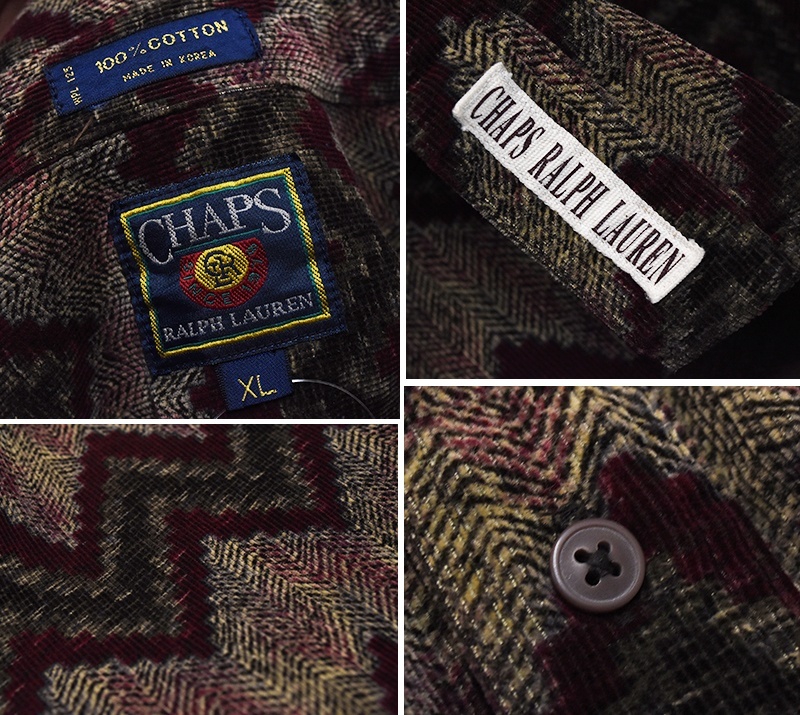 【CHAPS】チャップス【ラルフローレン】【POLO ralph lauren】【エンジ×緑】模様プリント ボタンダウン【コーデュロイシャツ】【サイズXL】