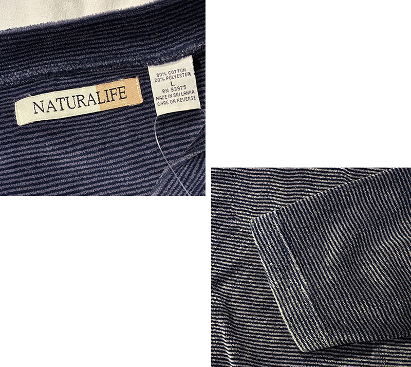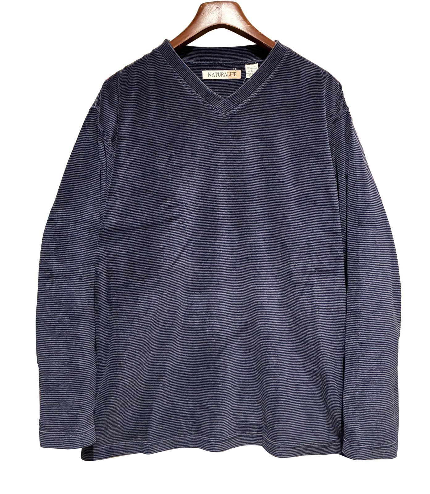 ビンテージ【NATURALIFE】ネイビーx紫【マイクロボーダー】【ベロア】【VネックロンT】【サイズL】