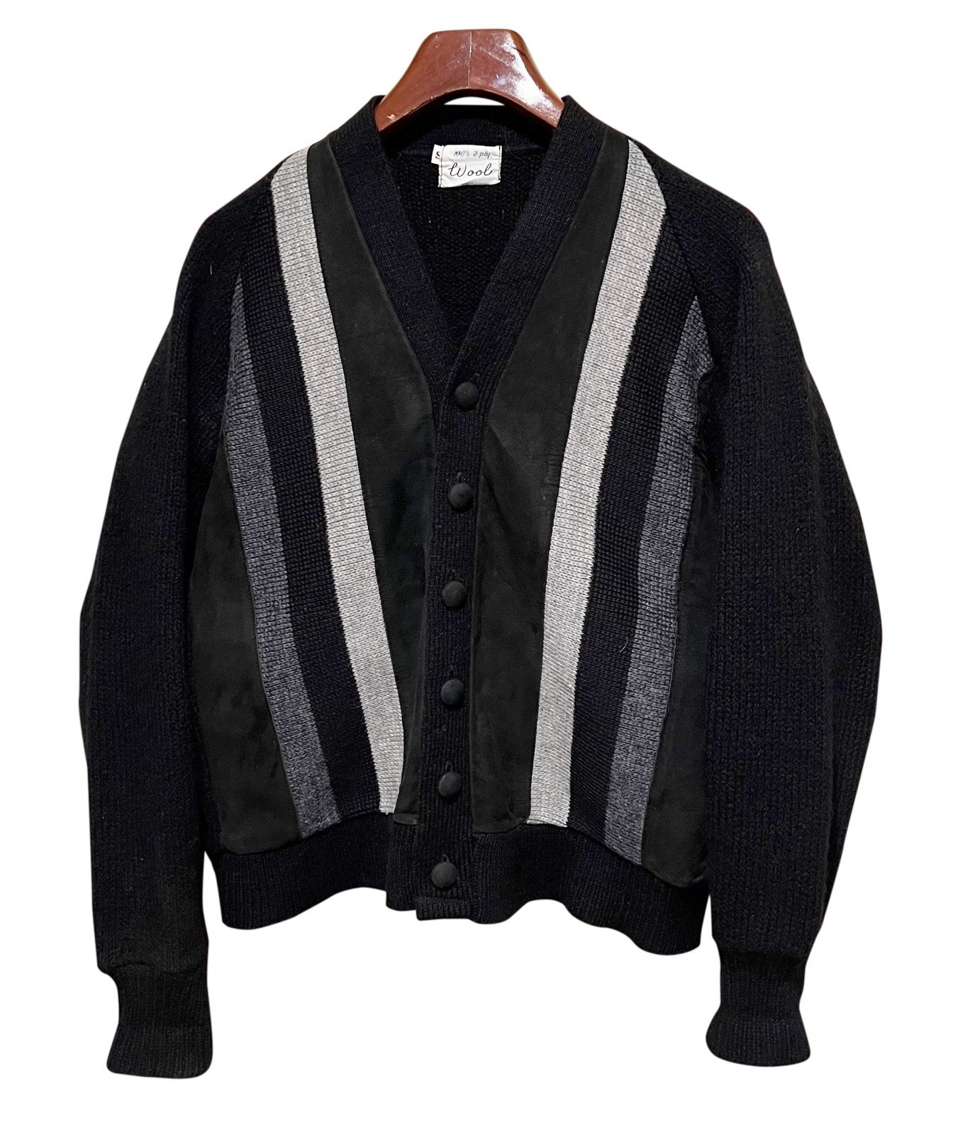 70’s ビンテージ【WOOL】ウール【スエードxグレーxチャコールx白】ライン 黒 カーディガン【サイズS】