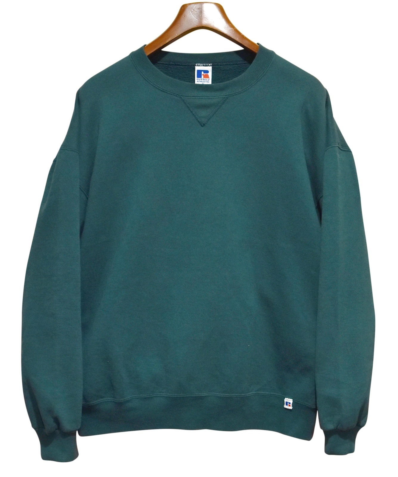 90's【USA製】【RUSSELL】ラッセル 【ビンテージ】緑【無地】【クルーネック】前V スウェット【サイズXL】