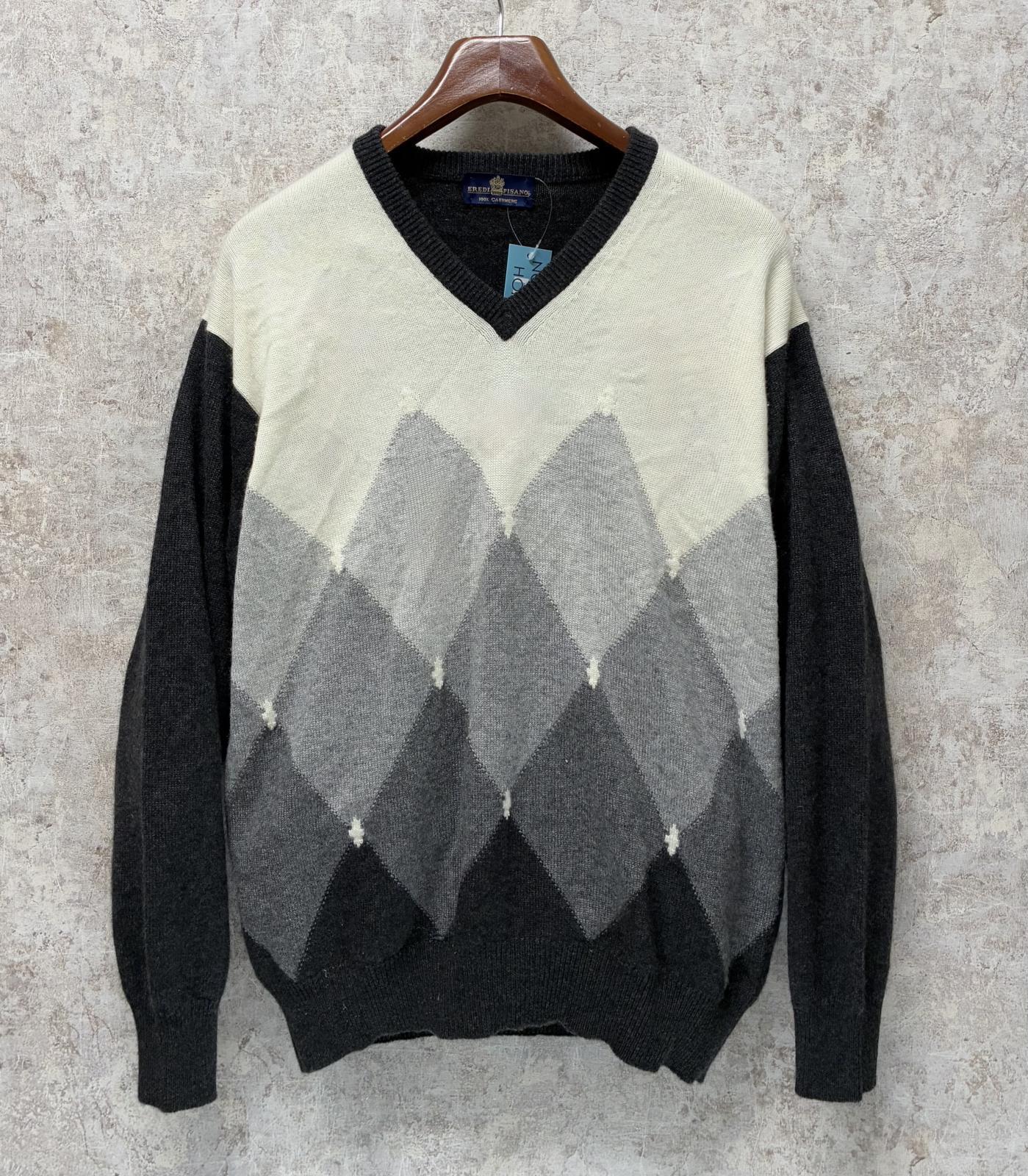イタリー製【EREDI PISANO】【グレーxチャコールx黒】【アーガイル】【Vネックセーター】カシミアセーター【サイズL】