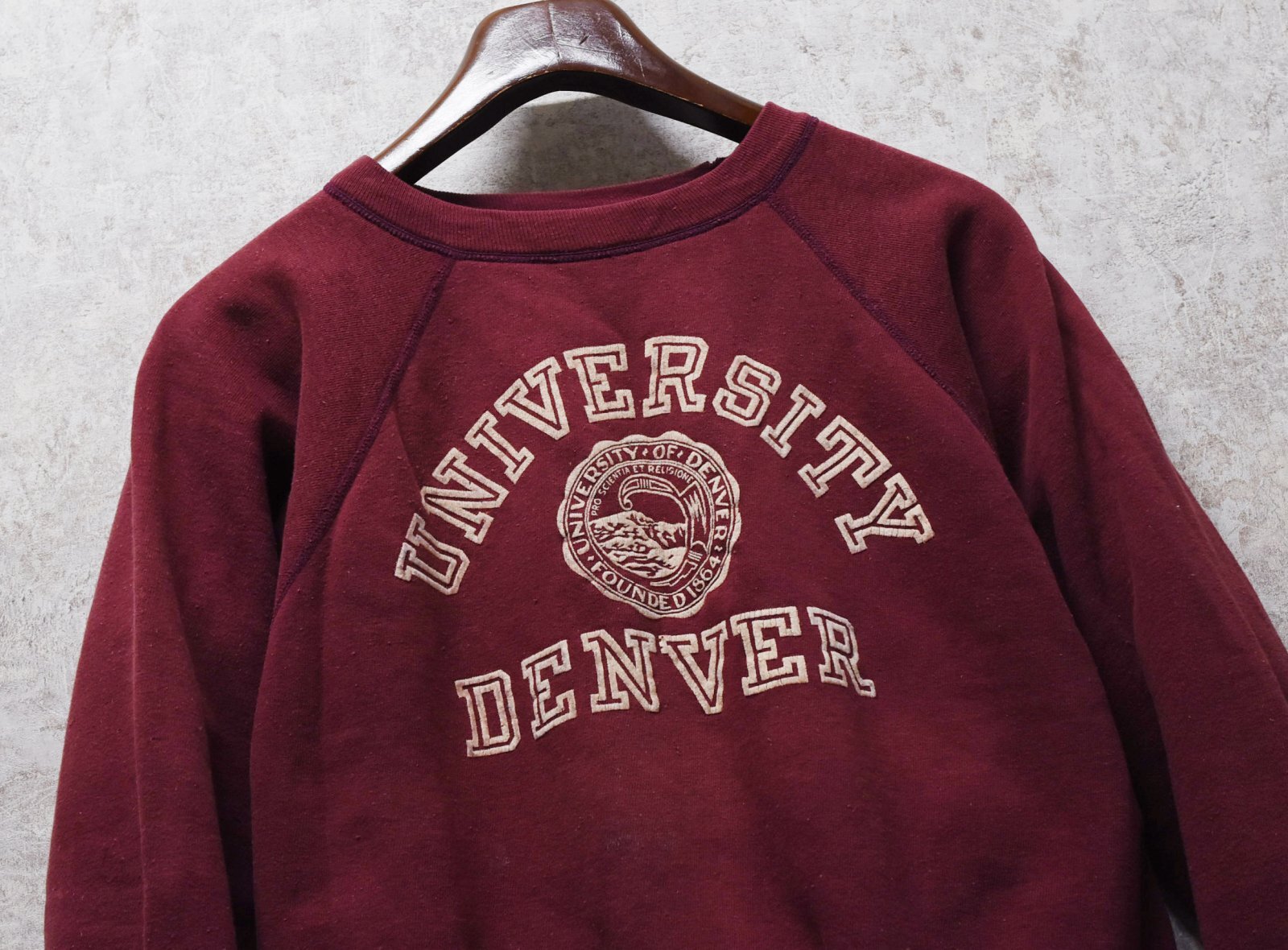 60's【ビンテージ】【DENVER UNIVERSITY】デンバー大学【フロッキープリント】カレッジロゴ【エンジ】【スウェット】【サイズL程度】