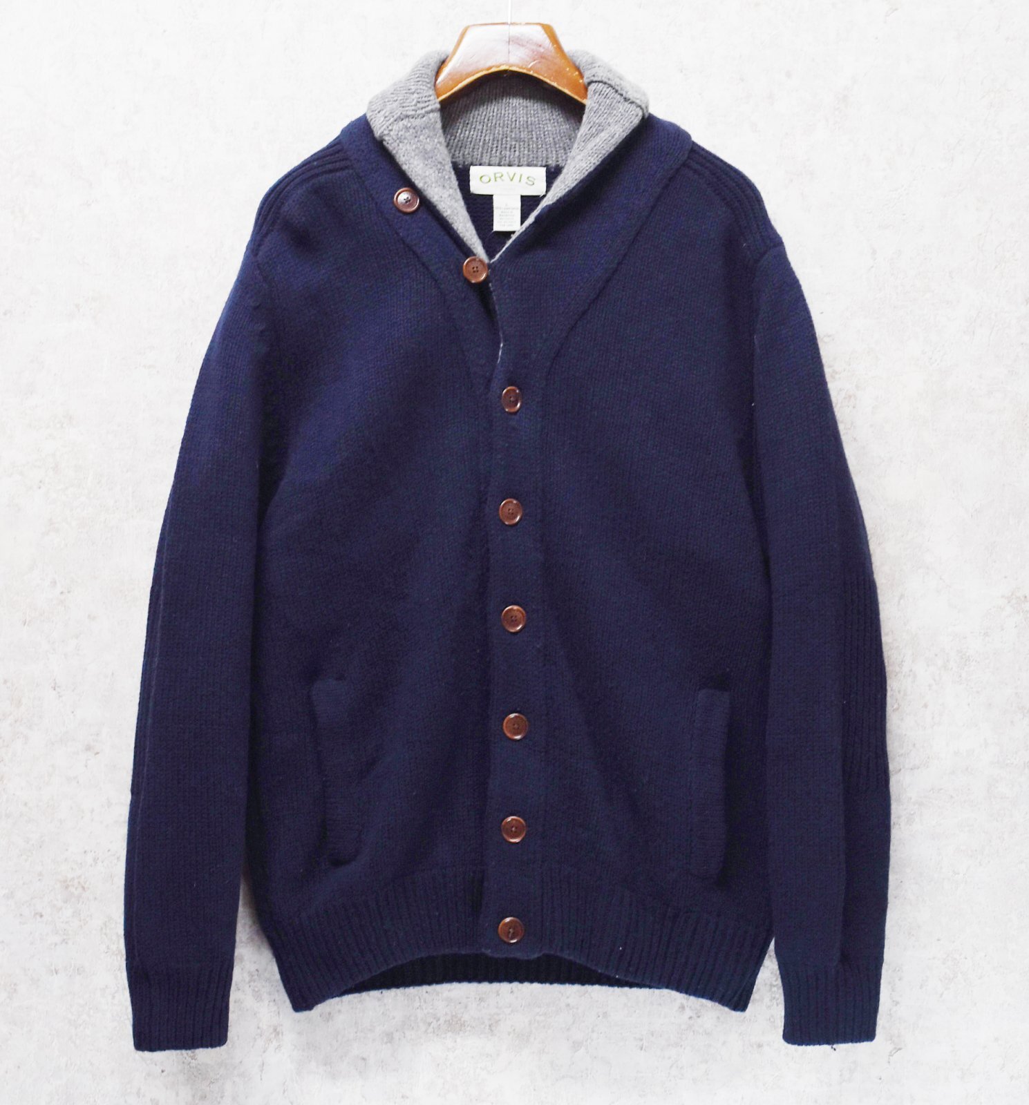 ビンテージ【ORVIS】オービス【紺×首元グレー】【ラムズウール】ショールカラーカーディガン【ウールカーディガン】【サイズL】