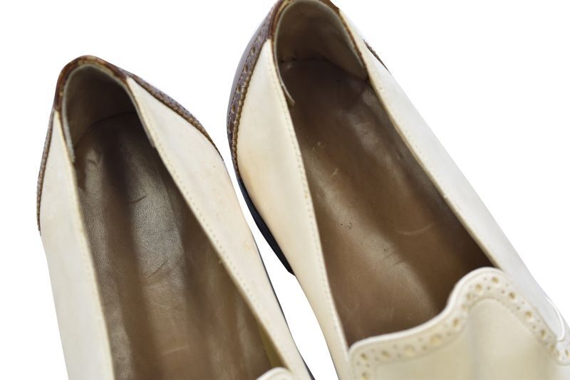 ◆商品説明◇ 50年代頃のホワイトヌバックとブラウンレザーの 2トーンのウィングチップのスリッポン。 横幅も広めで、良いサイズ感です。 実寸を参考に是非お願いします。 ◆サイズ◇ サイズ表記:不明(27cm程度) 素材・材質:レザー 実寸 アウトソール全長:約29cm 最大横幅:約10.5cm ◆コンディション◇ 全体的に経年の使用による レザーの細かい汚れや傷、シワ等があります。 カカトはそれほど減っていません。 画像でご確認ください。 その他、特筆すべき大きなダメージはありません。 50's【ビンテージ】【ホワイト×ブラウン】ウィングチップ【スリッポン】【レザーシューズ】【27cm程度】 [BC0205-8] Tweet 返品特約に関する重要事項 お問い合わせ お気に入り登録
