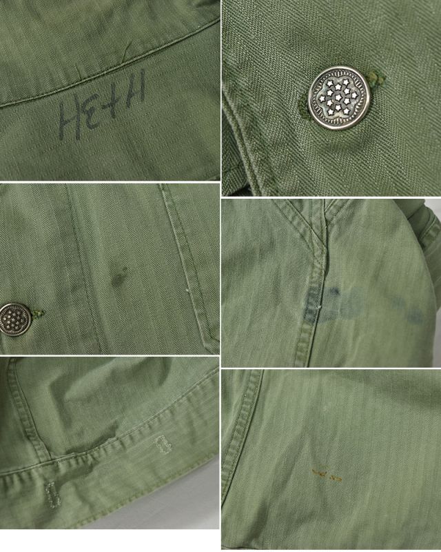 ◆商品説明◇ 40'sのUSアーミーの M41、HBTジャケットです。 サイズ表記が消えていますので、 実寸を参考に是非よろしくお願いします。 ◆サイズ◇ サイズ表記:不明 素材・材質:コットンetc 実寸(平置きで) 肩幅(肩〜肩) :約51cm 身幅(脇下〜脇下):約70cm 袖丈(肩〜袖先) :約64cm 着丈(襟下〜裾) :約72cm ◆コンディション◇ サイドアジャスターが欠損しています(画像参照) 全体的に細かい汚れや色あせなどの 中古感があります。 特筆すべき大きなダメージはありません。 40's【ビンテージ】【米軍実物】U.S.ARMY【M-41】M41 M42 【HBTジャケット】 [CE2802-19-50-CF11] Tweet 返品特約に関する重要事項 お問い合わせ お気に入り登録